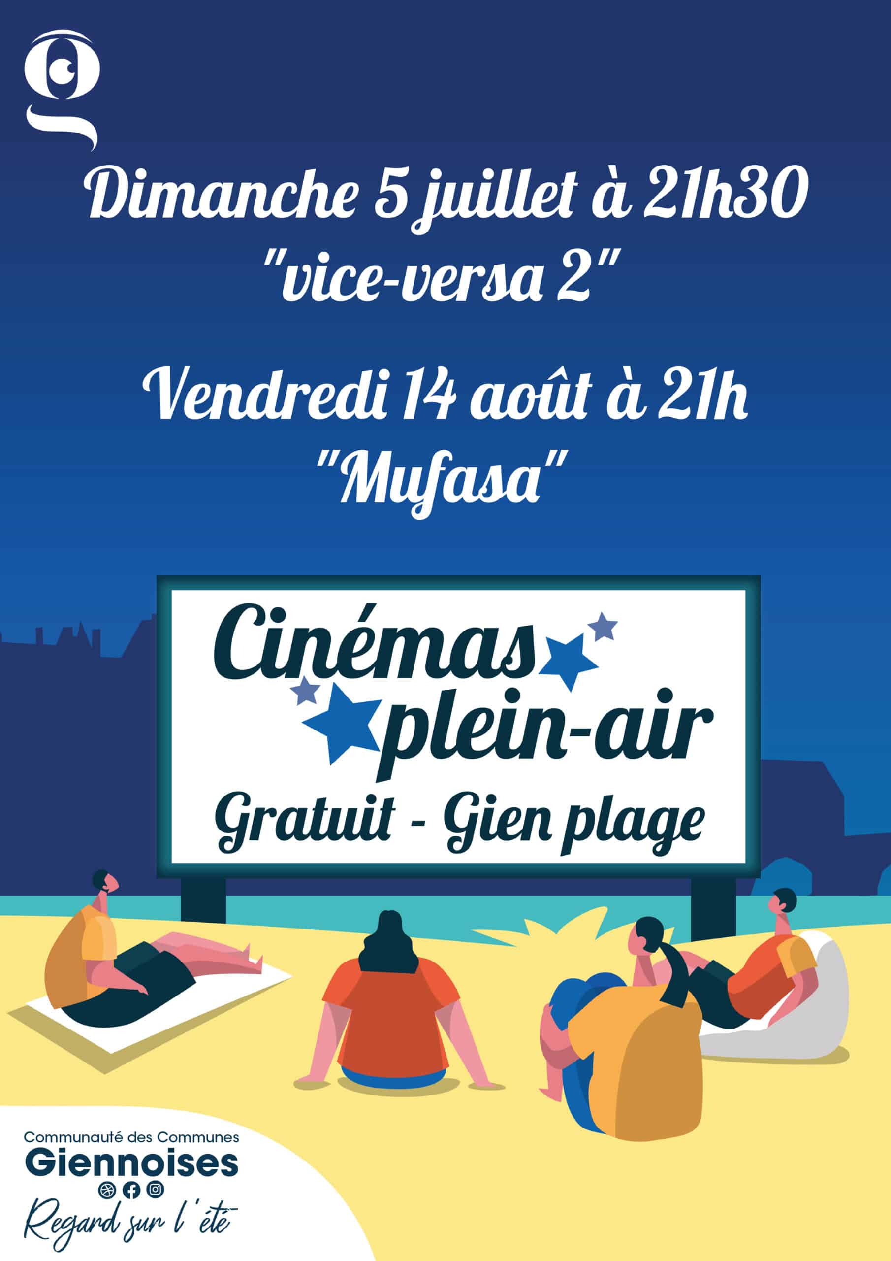 La Communauté des Communes Giennoises vous proposent 2 séances de cinéma nocturnes en plein air sur la plage du Berry (à côté du camping) durant la saison estivales (si les conditions météorologiques sont favorables). Vendredi 14 août à 21h avec le film d'animation "Mufasa".